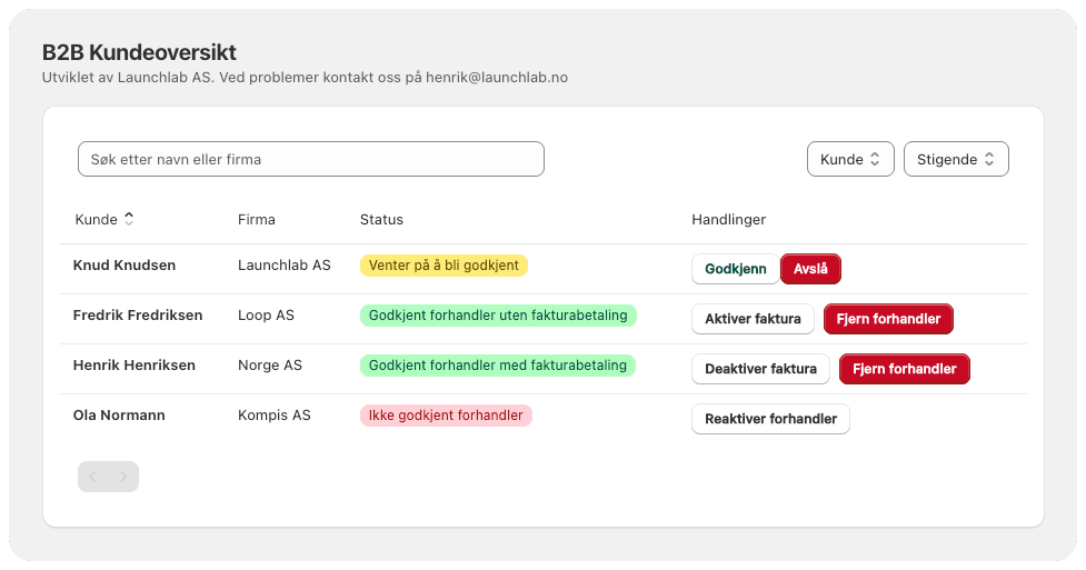 B2B system som er skreddersydd og laget av Henrik i Launchlab, som passer nøyaktig til det kunden trenger.